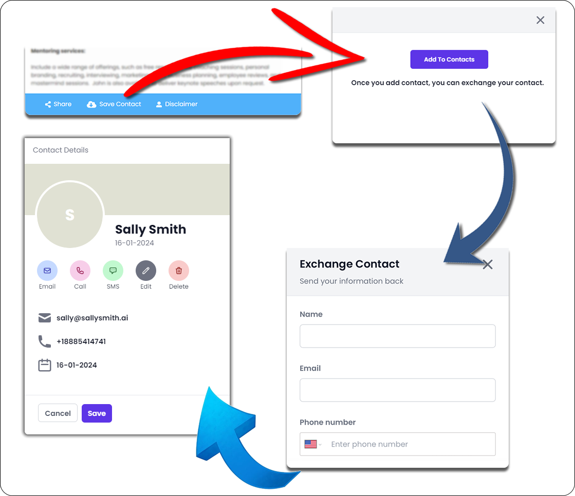 Anyone viewing your digital hub can save your contact information to their mobile's contacts and they can easily exchange their information with you.
